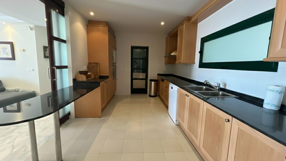 La elegante y moderna cocina está totalmente equipada con electrodomésticos y acabados de primera calidad, complementados por una zona de servicio separada que mantiene la vida diaria organizada sin esfuerzo.