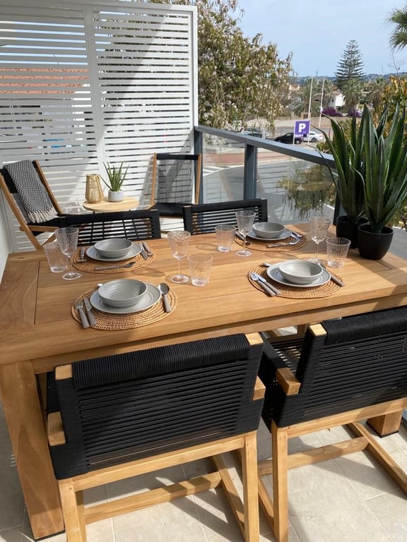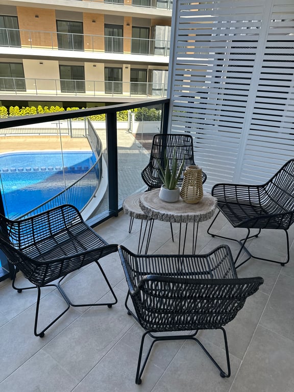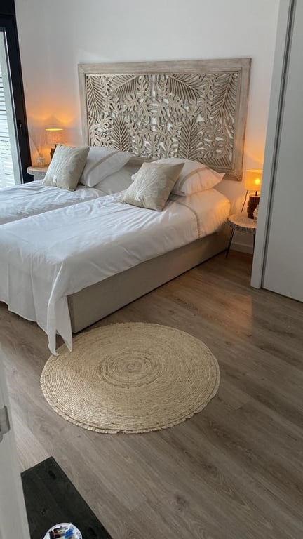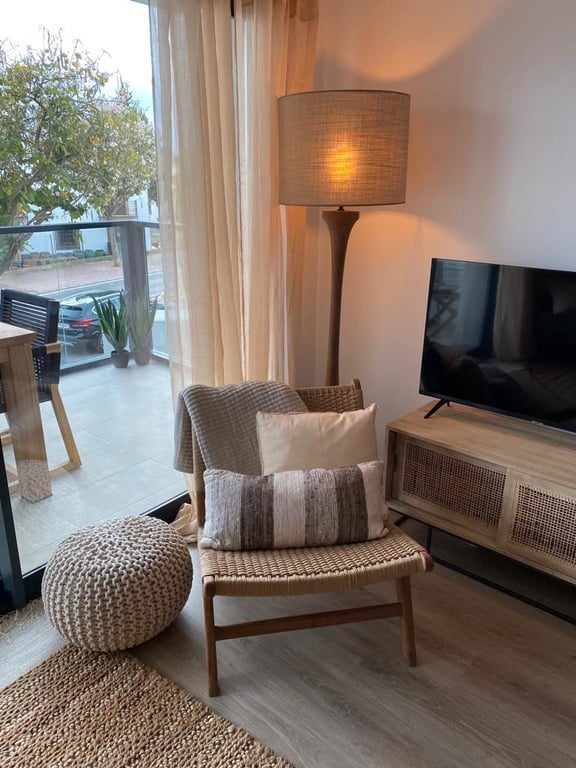 El interior combina líneas modernas y depuradas con materiales naturales cálidos. Un salón y comedor abiertos se integran con una cocina a medida con acabados de alta calidad. Grandes ventanales y puertas correderas permiten la entrada de mucha luz natural y enmarcan la vista al mar. Las zonas de descanso incluyen una tranquila suite principal con baño en suite y armarios empotrados, además de habitaciones de invitados bien equipadas y baños familiares.