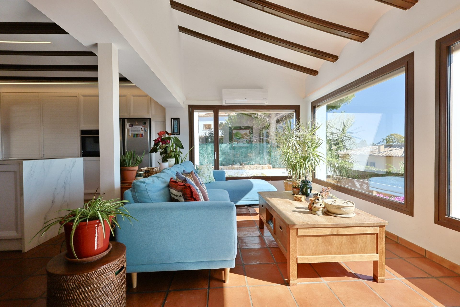 Renovada en 2018, se distribuye en dos plantas con estancias luminosas y bien conectadas: un salón-comedor amplio con grandes ventanales que aportan luz natural y continuidad visual con el exterior, una cocina de diseño equipada con isla central ideal para el día a día y para recibir, además de despacho y lavadero. La vivienda dispone de 3 dormitorios, destacando la suite principal con vestidor y baño en suite, y cuenta también con un dormitorio en planta baja con baño completo, perfecto para invitados o para mayor comodidad si se busca evitar escaleras.