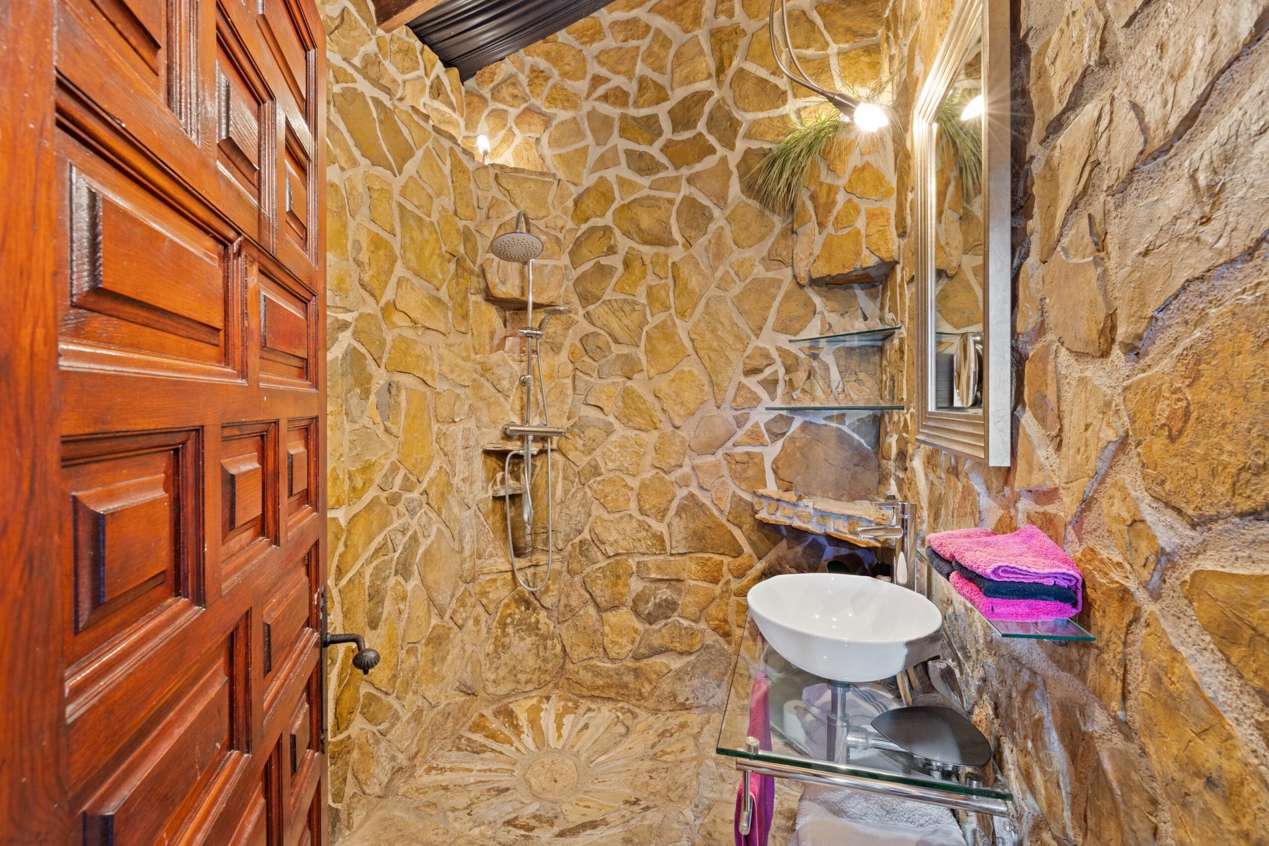 La casa principal cuenta con un amplio salón con chimenea, una acogedora Naya con vistas al jardín, un comedor y una cocina moderna y totalmente equipada. En la planta baja hay dos cómodos dormitorios y un baño.