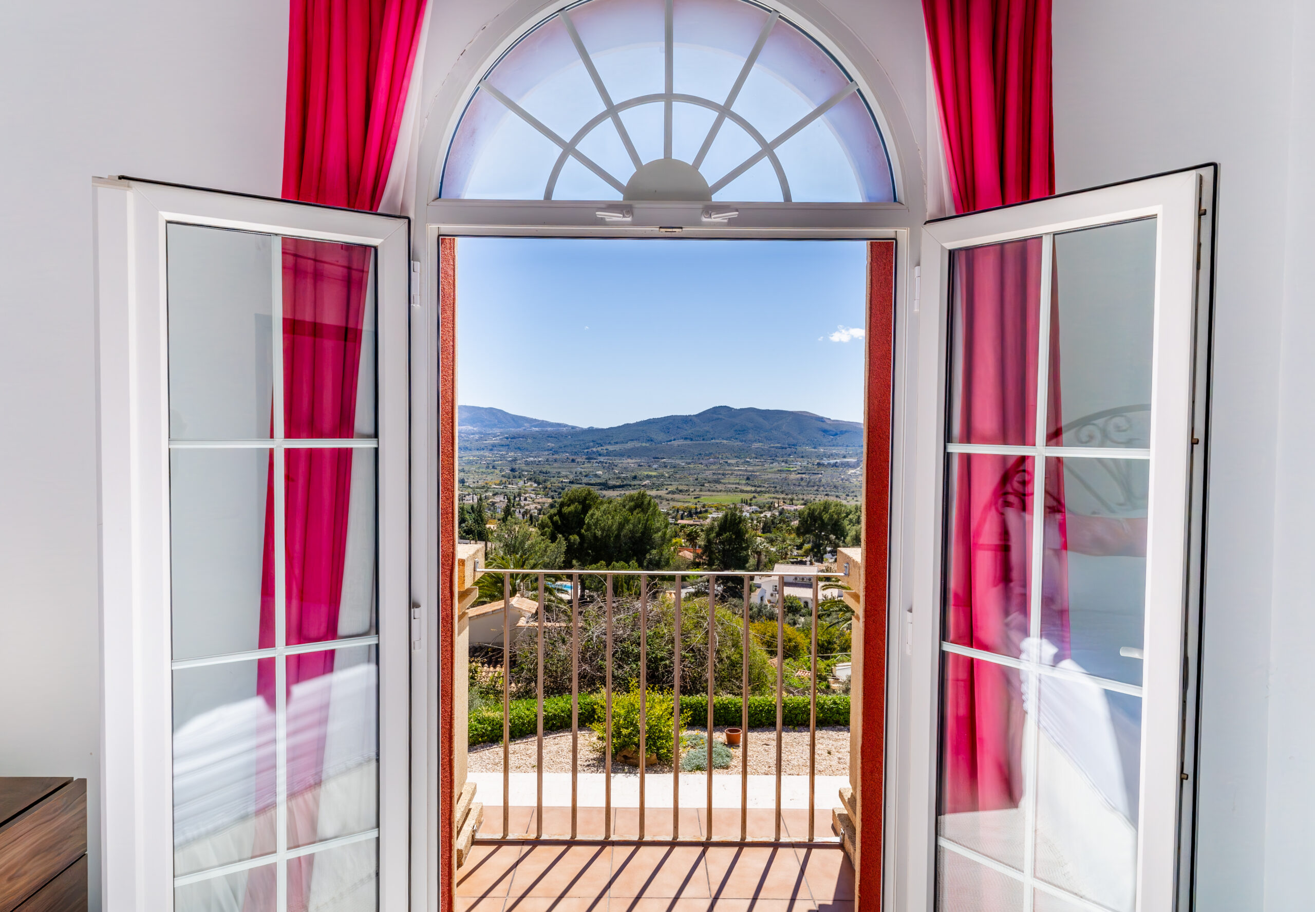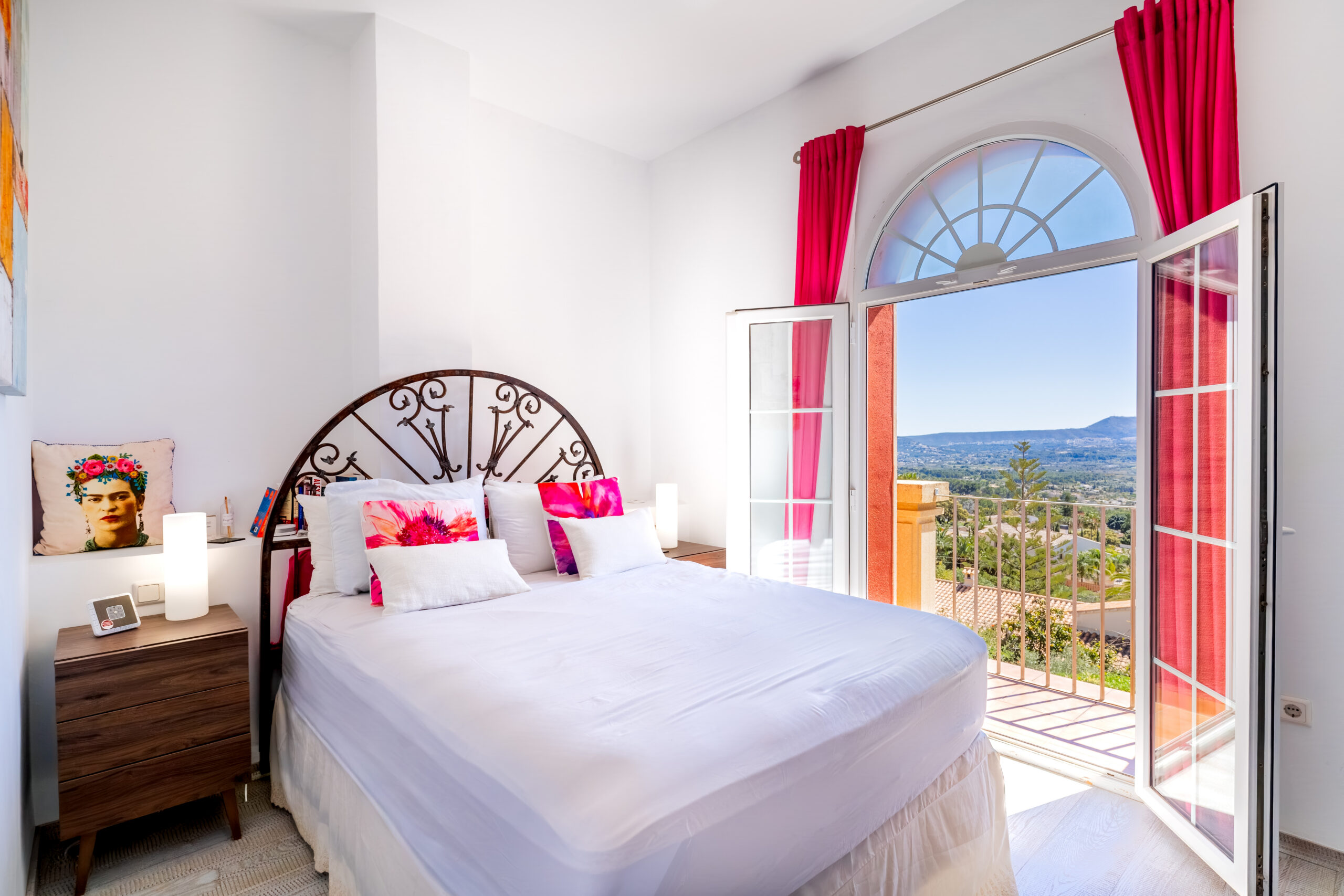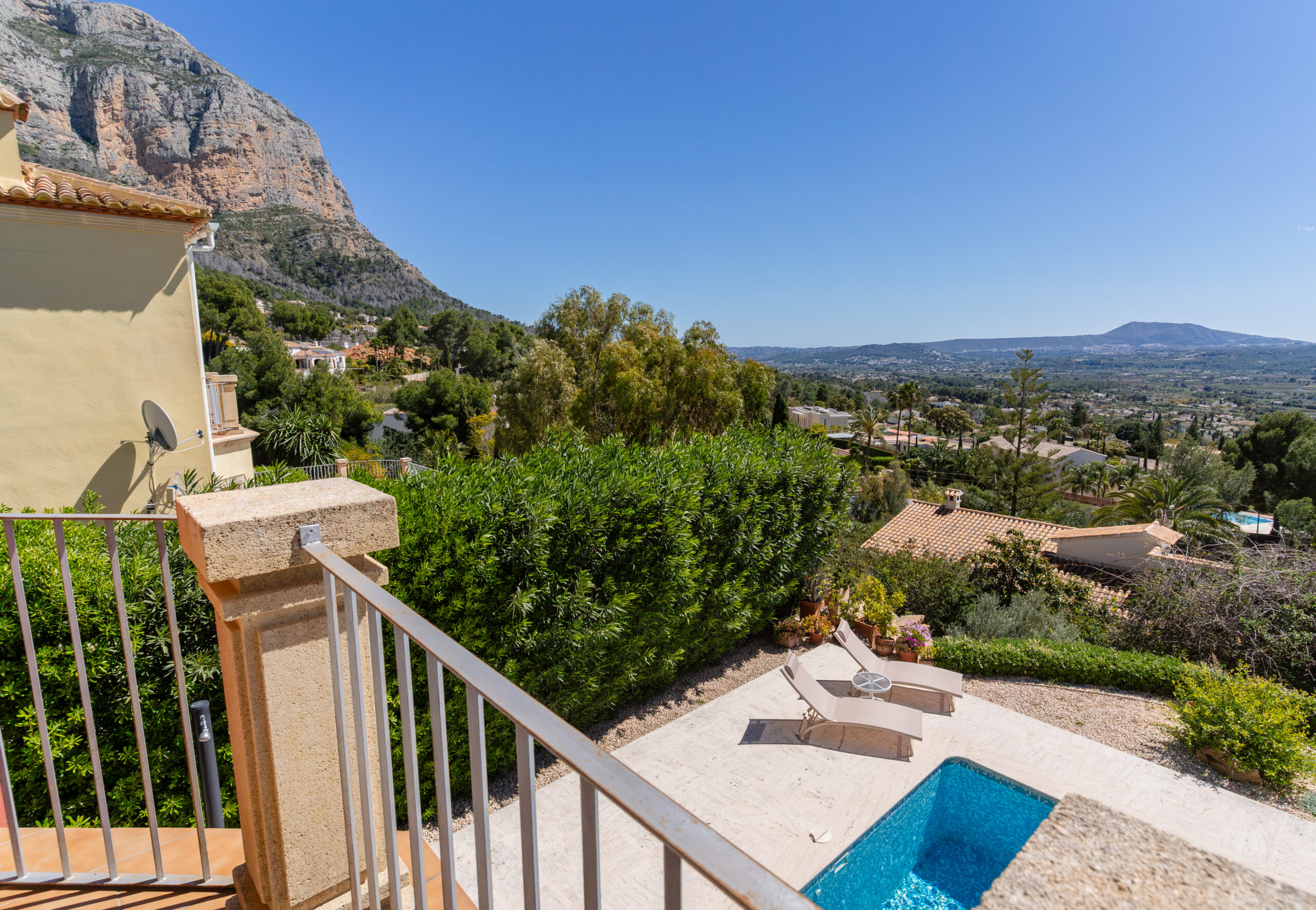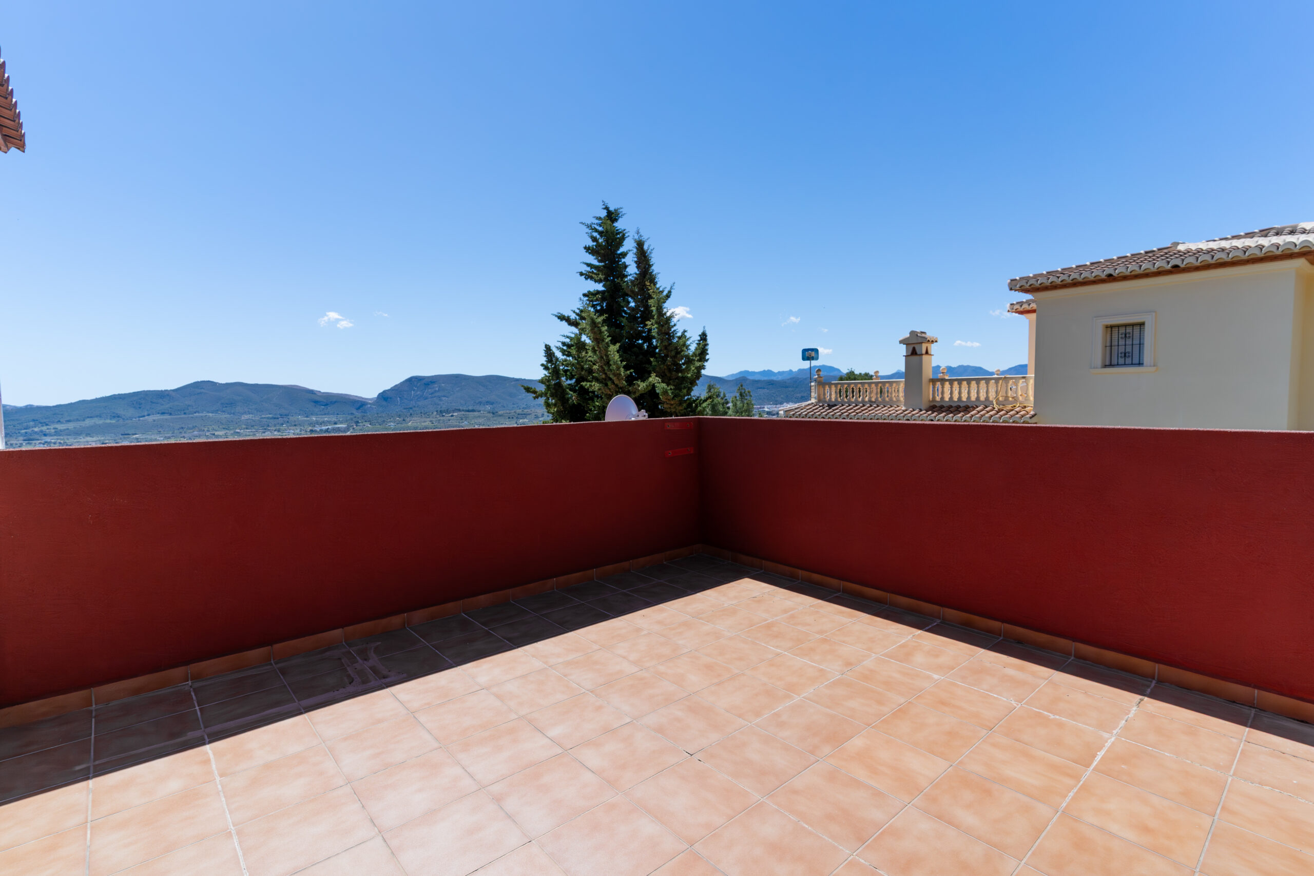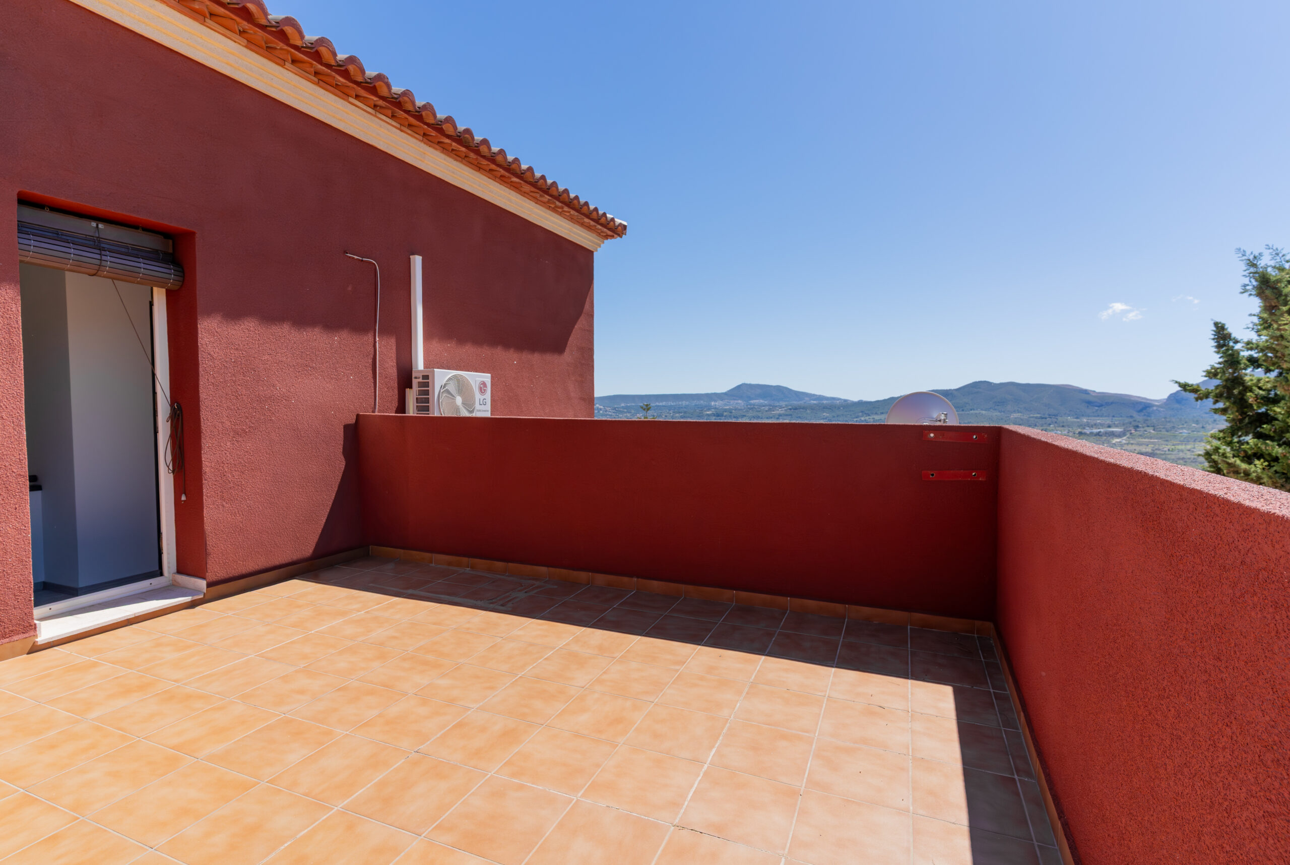 La planta superior alberga dos dormitorios amplios y luminosos que comparten un baño completo de generosas dimensiones. Ambos dormitorios cuentan con balcón y acceso a una terraza, desde donde se contemplan unas impresionantes vistas abiertas al Montgó, al valle y al paisaje montañoso que rodea la propiedad.