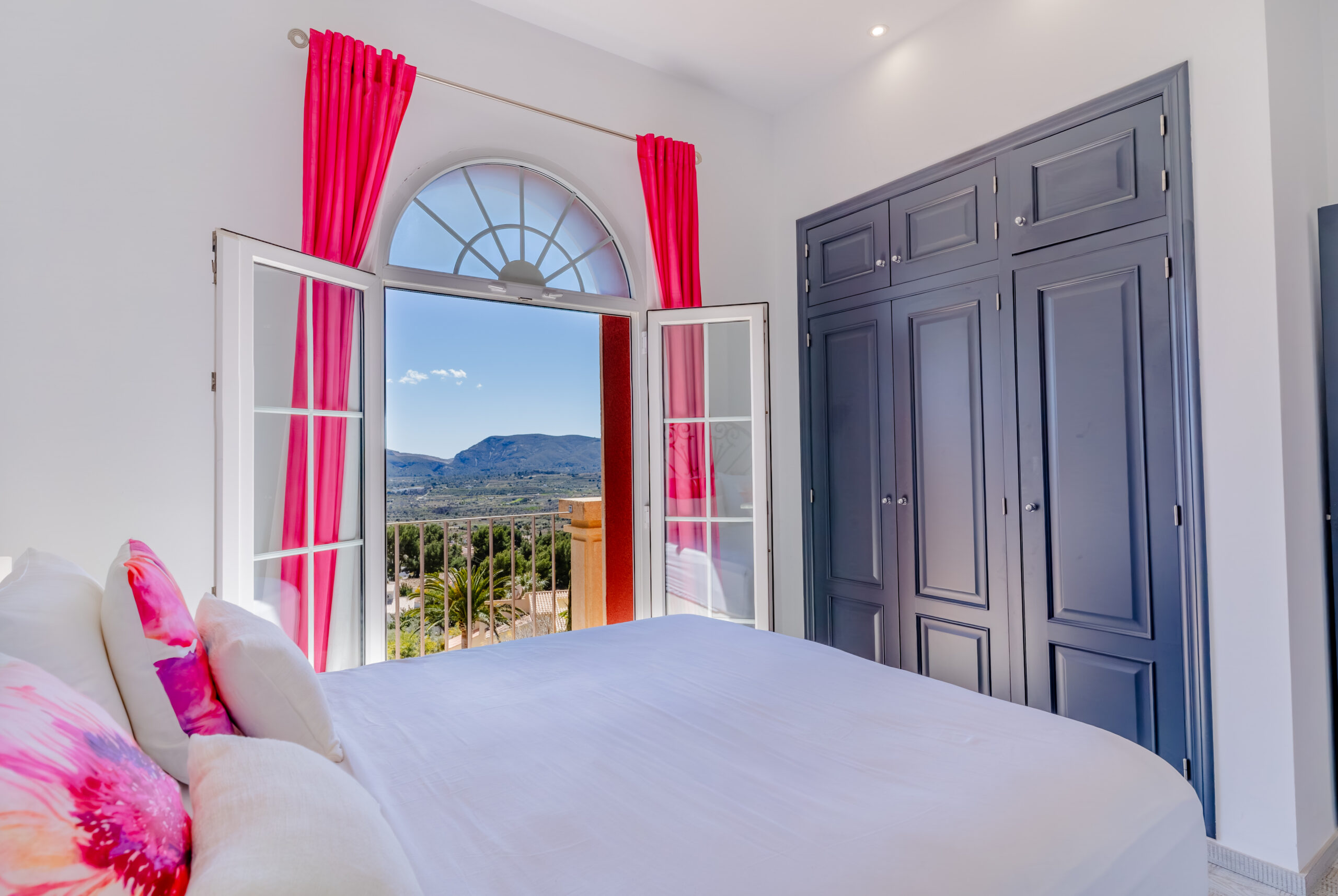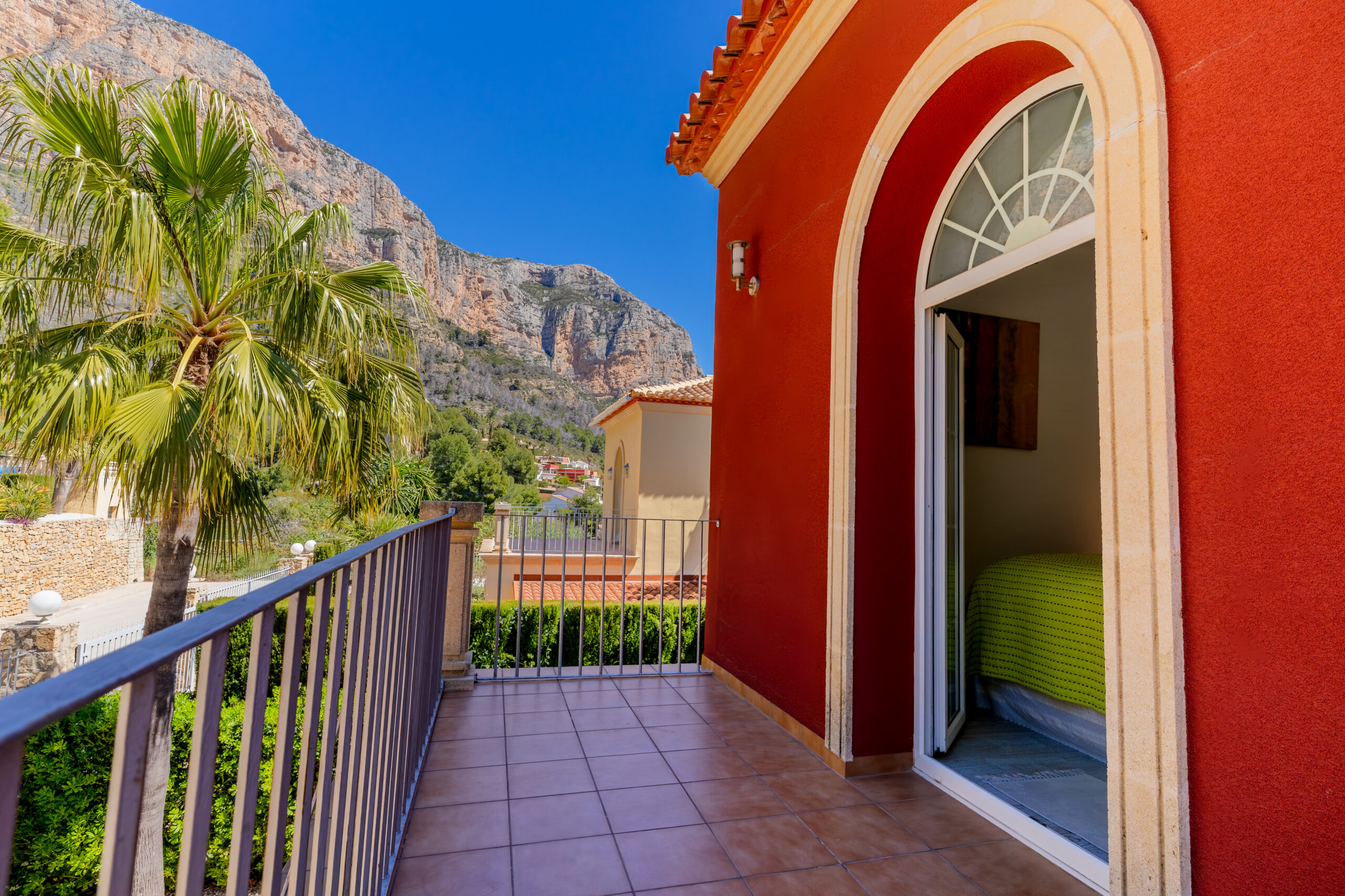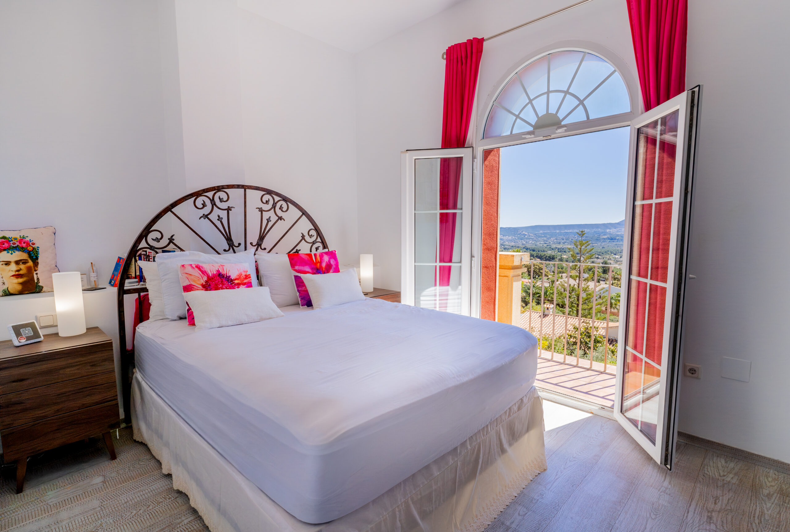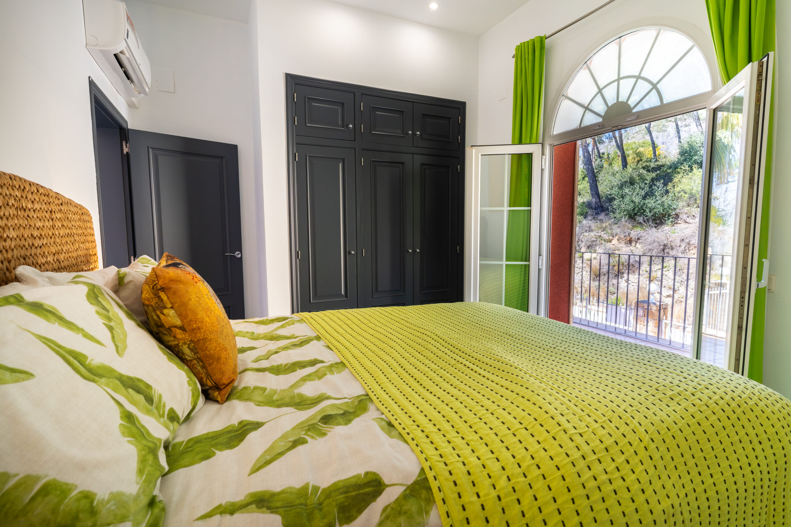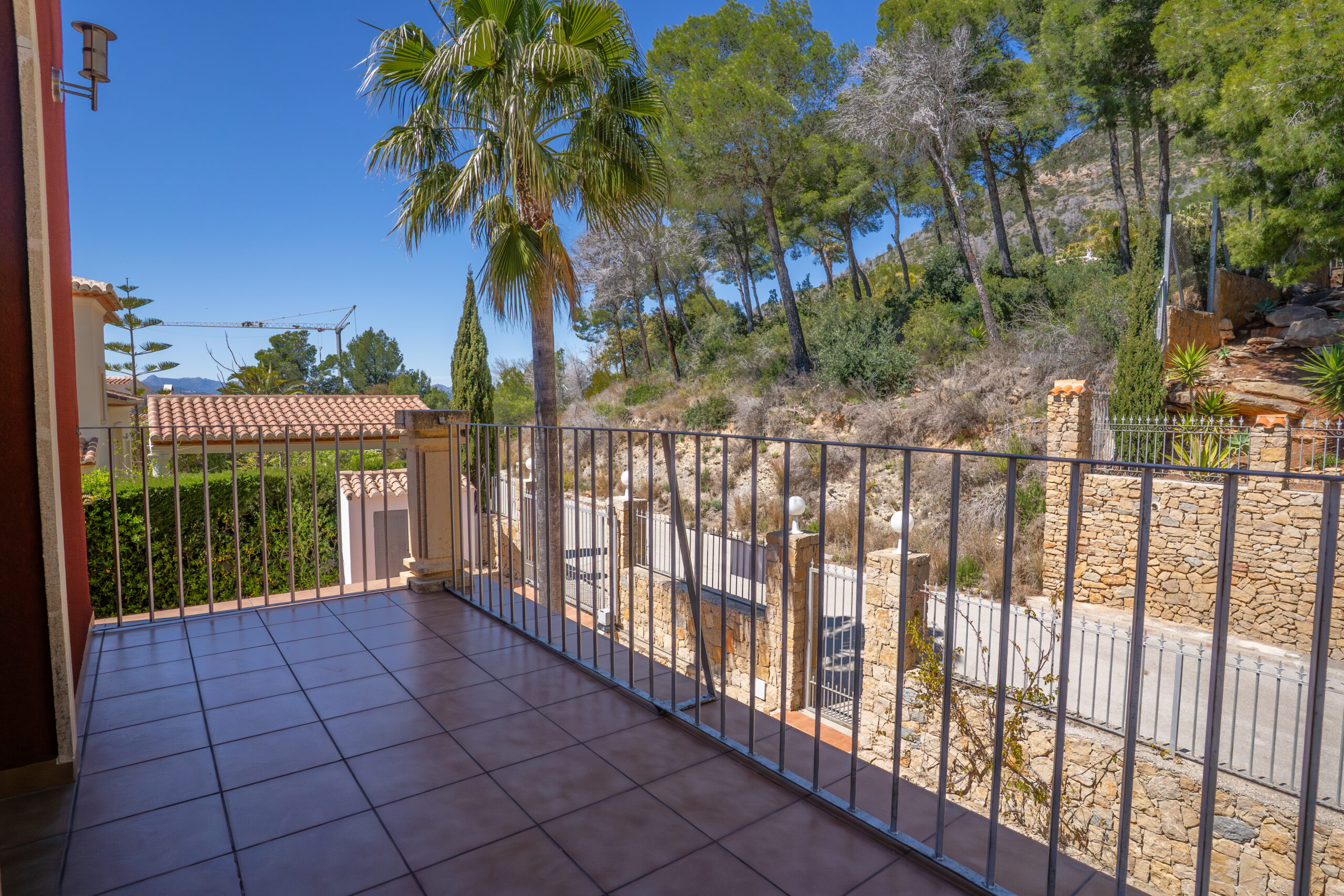 La planta superior alberga dos dormitorios amplios y luminosos que comparten un baño completo de generosas dimensiones. Ambos dormitorios cuentan con balcón y acceso a una terraza, desde donde se contemplan unas impresionantes vistas abiertas al Montgó, al valle y al paisaje montañoso que rodea la propiedad.