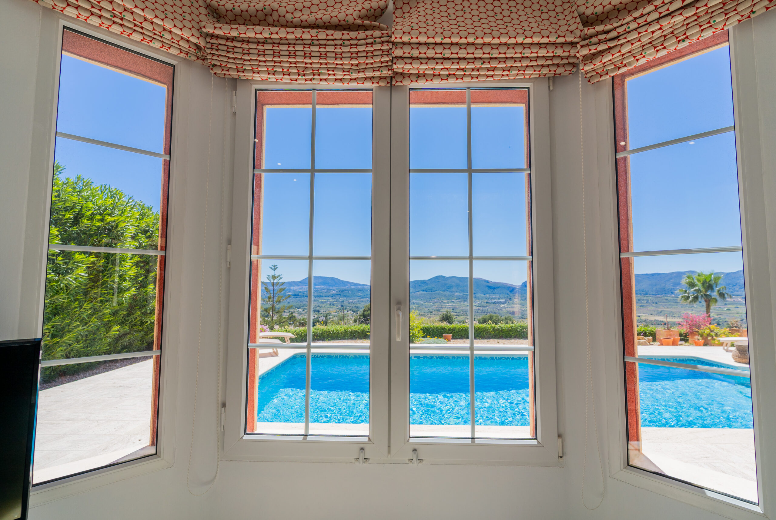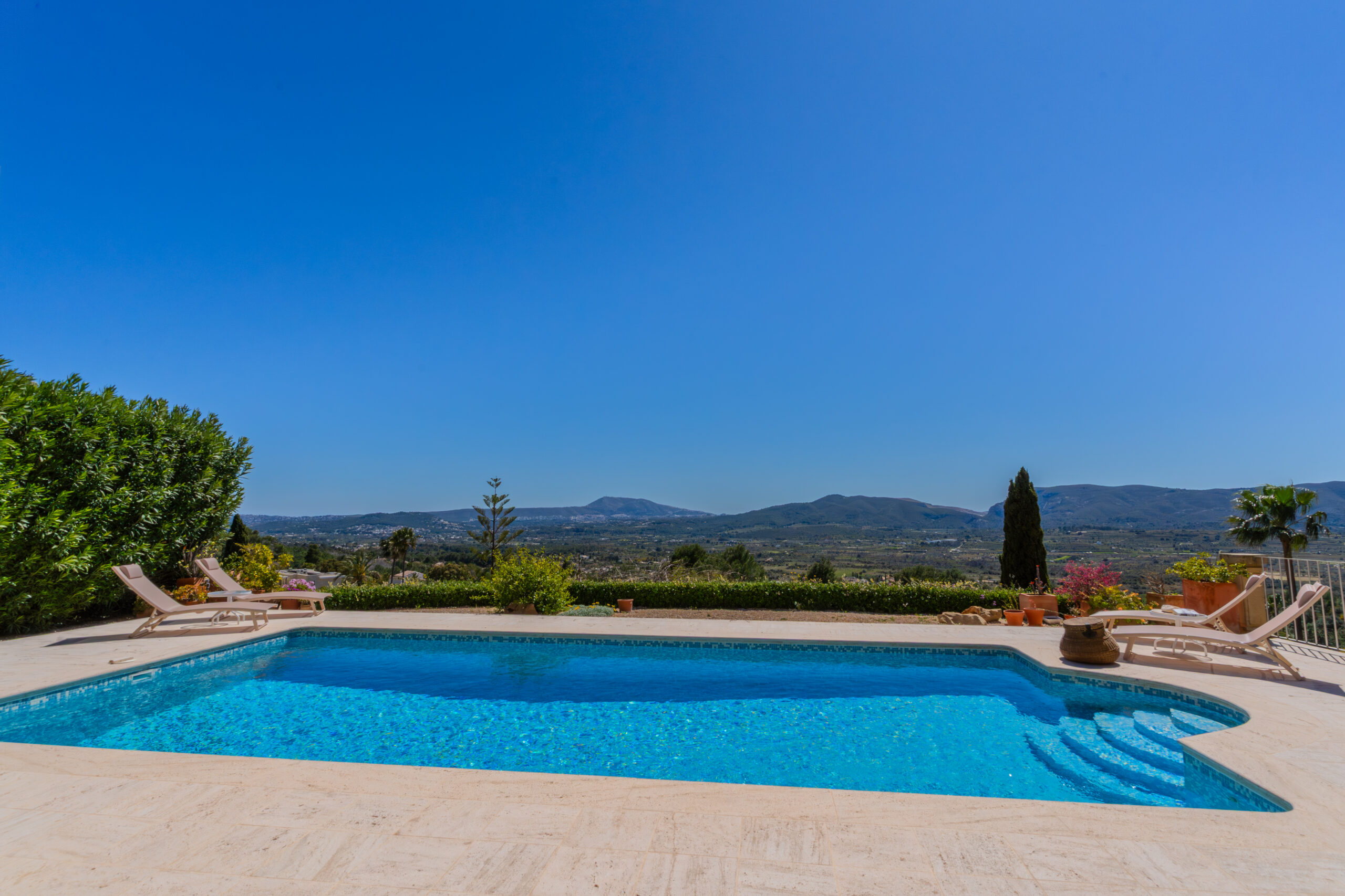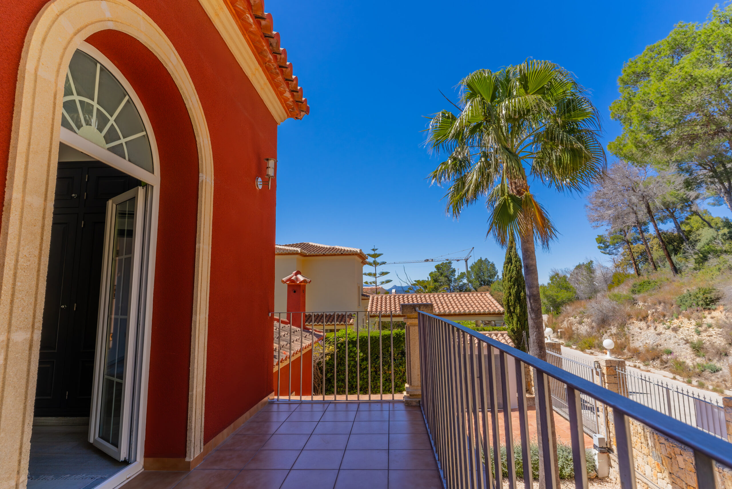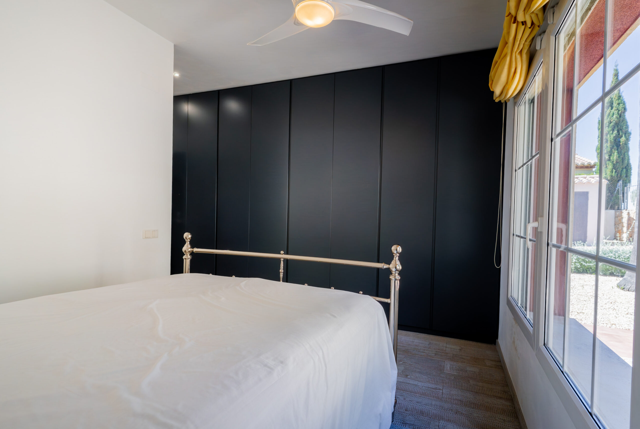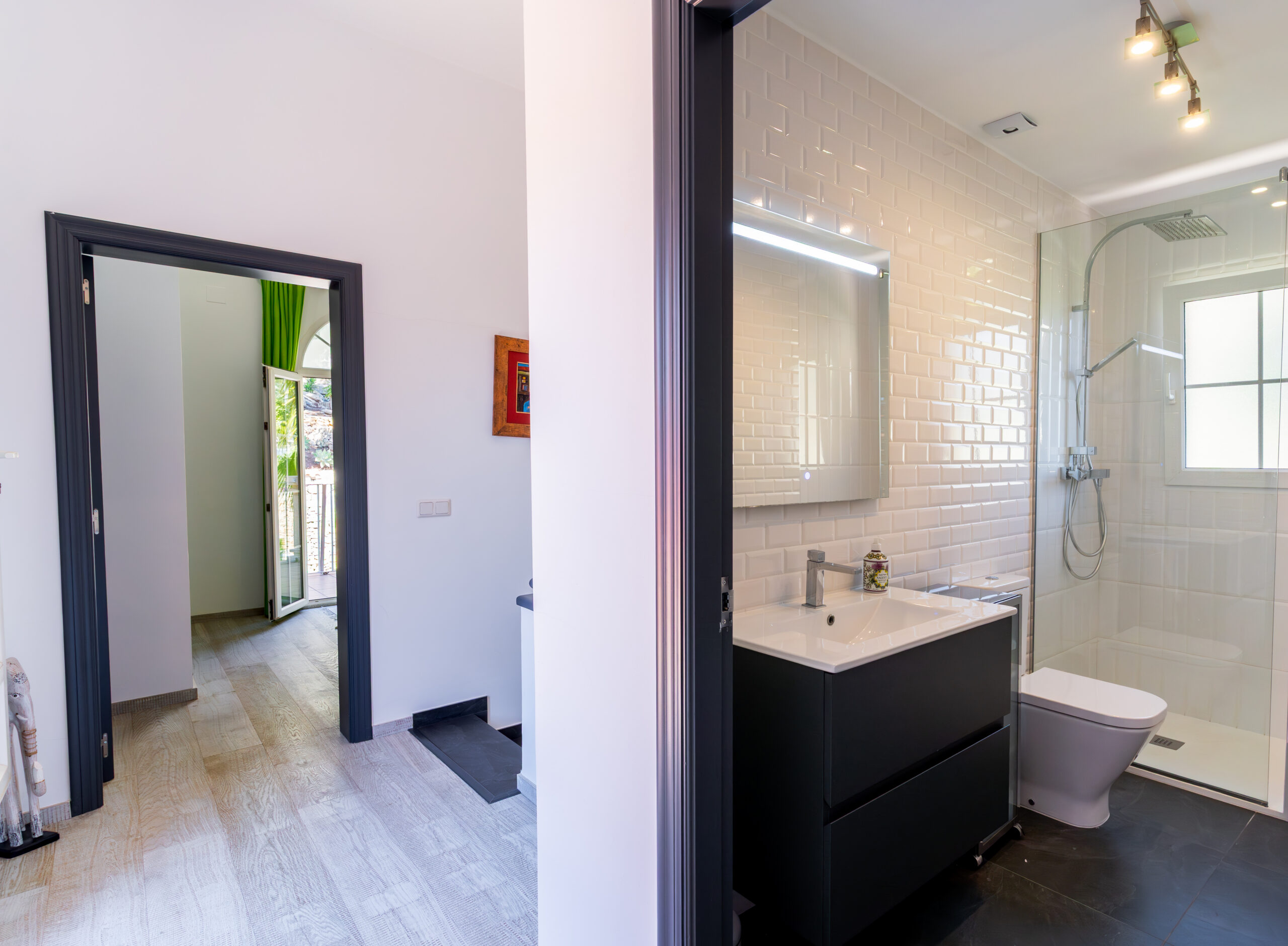 La planta superior alberga dos dormitorios amplios y luminosos que comparten un baño completo de generosas dimensiones. Ambos dormitorios cuentan con balcón y acceso a una terraza, desde donde se contemplan unas impresionantes vistas abiertas al Montgó, al valle y al paisaje montañoso que rodea la propiedad.