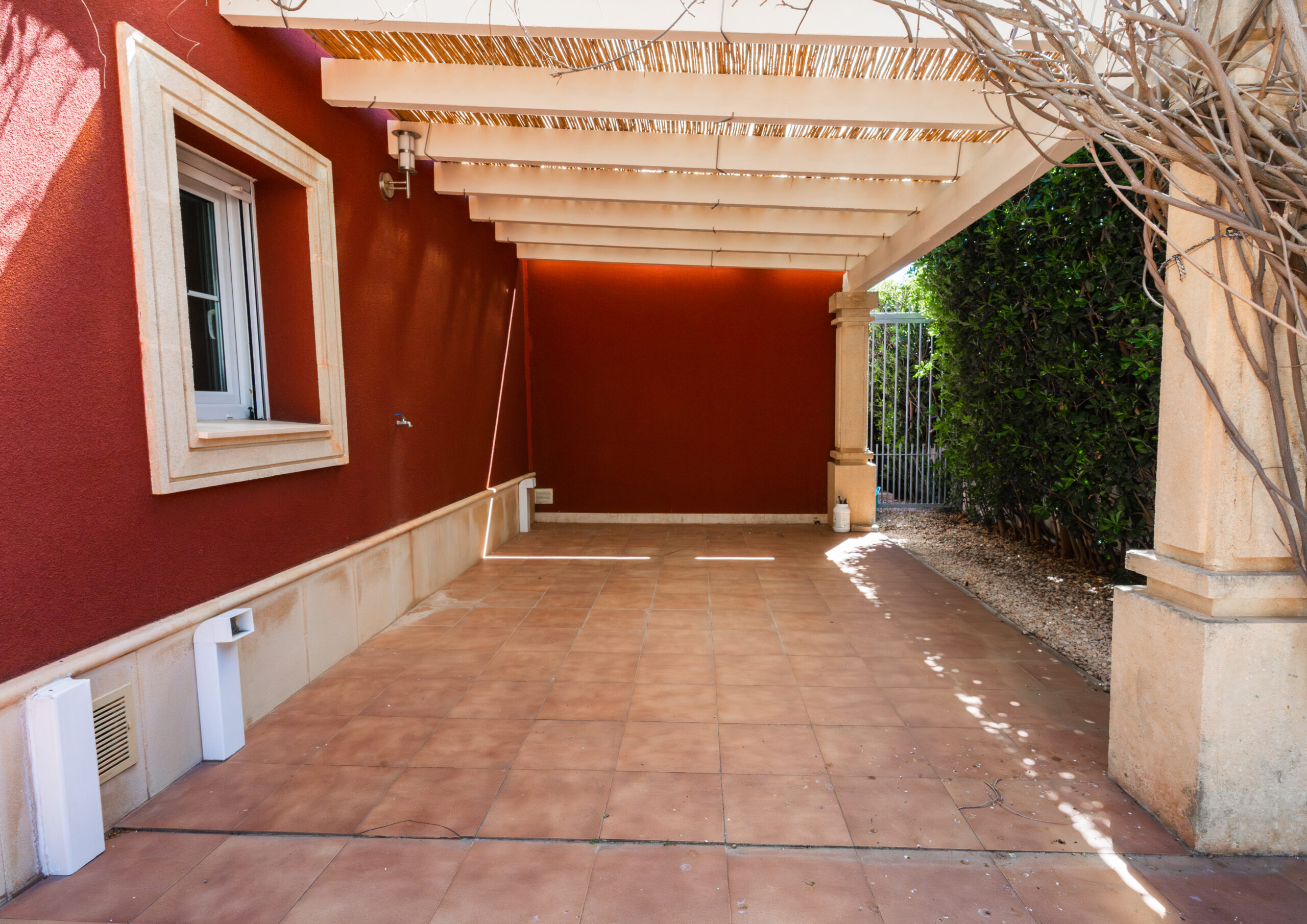 La entrada de la propiedad cuenta con parking cubierto mediante pérgola para un vehículo.