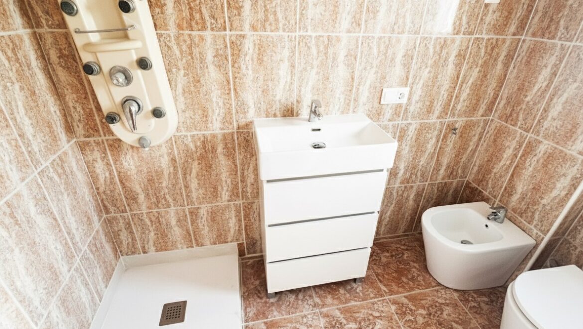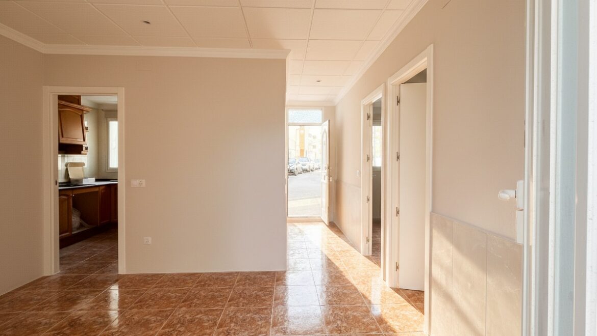 Inside, the layout is compact but full of possibility. You enter through a private front door into a short corridor. On the right is a bathroom with a shower. It is currently under renovation and soon to be completed. On the left are two bedrooms. The living and dining area form an L-shape, with a third space currently open-plan that could easily be converted into a single third bedroom or office.