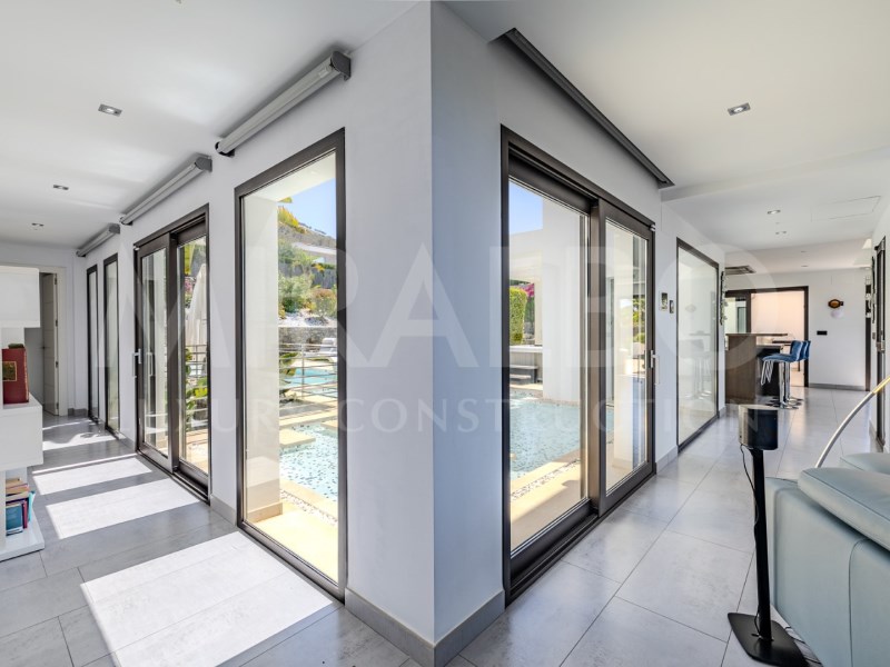 La villa cuenta con 5 lujosos dormitorios, cada uno con su propio baño en suite, lo que garantiza privacidad y comodidad. El amplio salón de concepto abierto, con impresionantes vistas al mar y a las montañas, ofrece un espacio perfecto para la relajación y el entretenimiento, rodeado de un entorno natural que complementa la sensación de exclusividad.