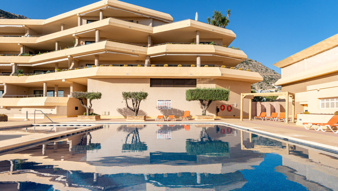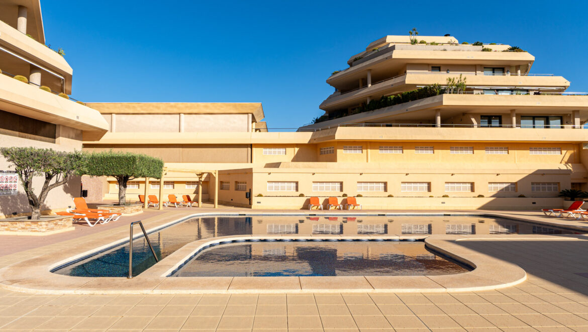 Residents can also enjoy the beautifully maintained communal pool, ideal for unwinding on warm Mediterranean days. The property comes equipped with air conditioning and heating, double glazing, satellite TV, and a security door for peace of mind.