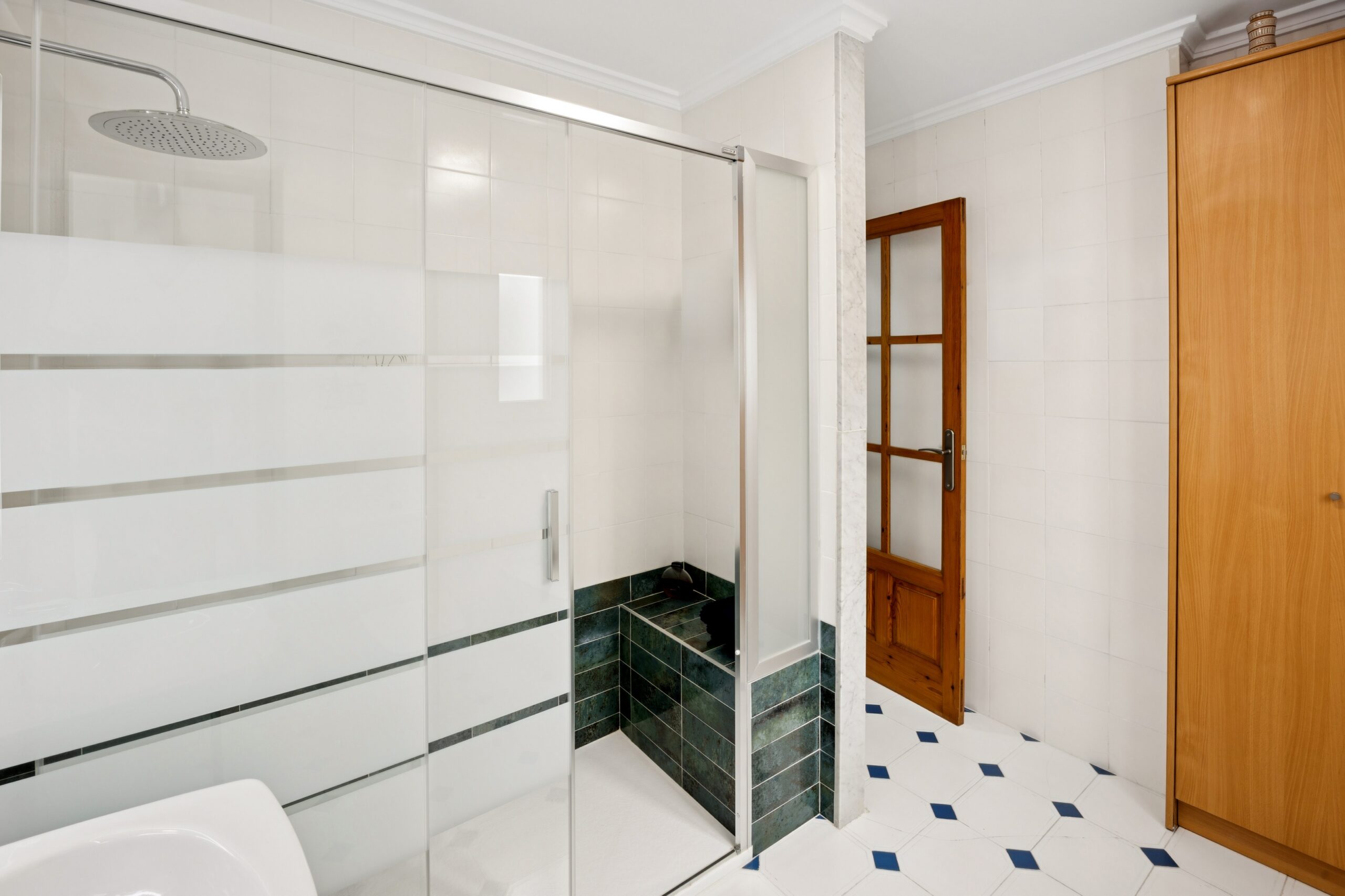 En la planta superior, un amplio rellano conduce a un elegante baño con ducha a ras de suelo y tres dormitorios de tamaño generoso, todos con armarios empotrados. Cada habitación tiene una ventana que ofrece luz y ventilación natural, y dos de las habitaciones disfrutan de encantadoras ventanas francesas y pequeños balcones.