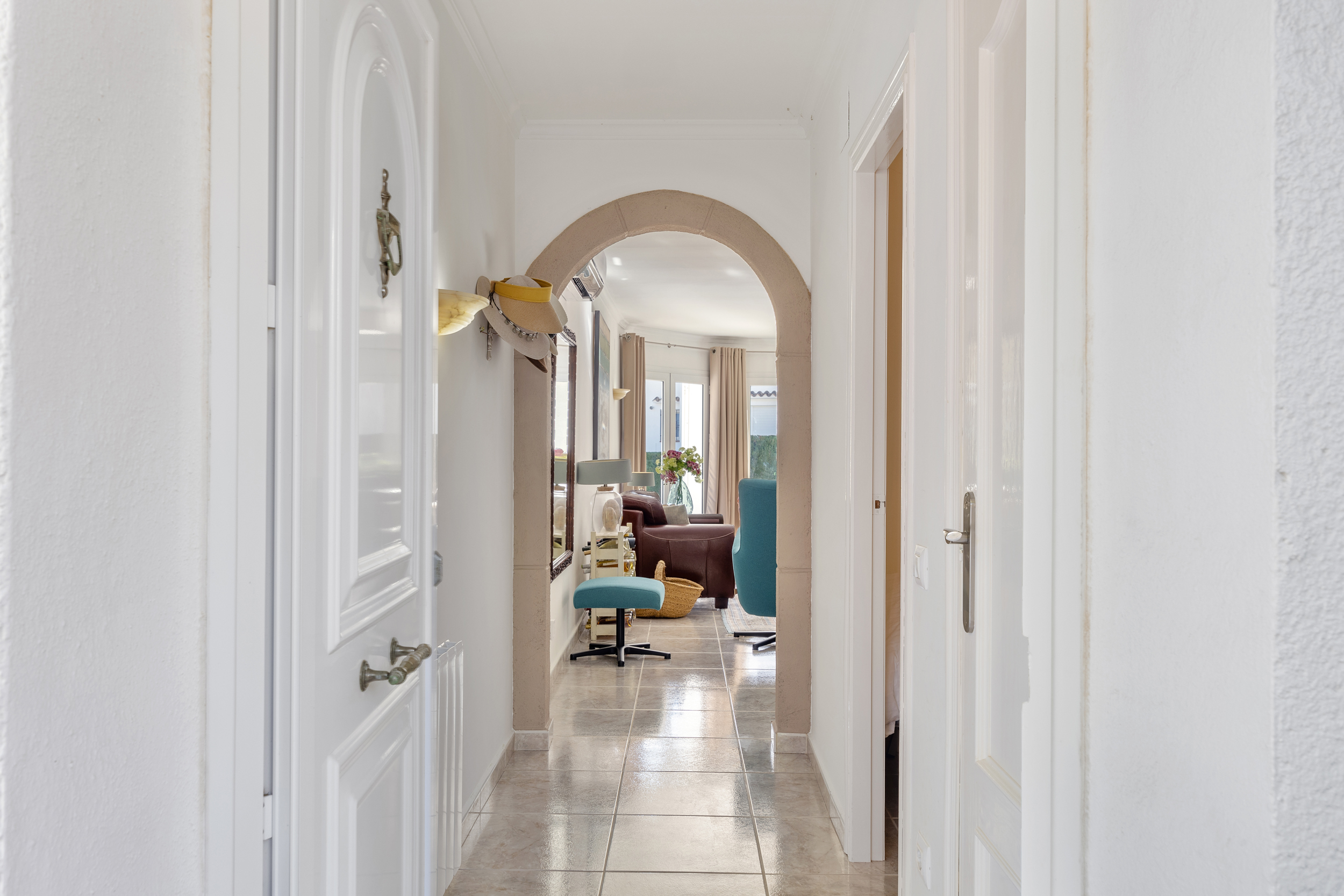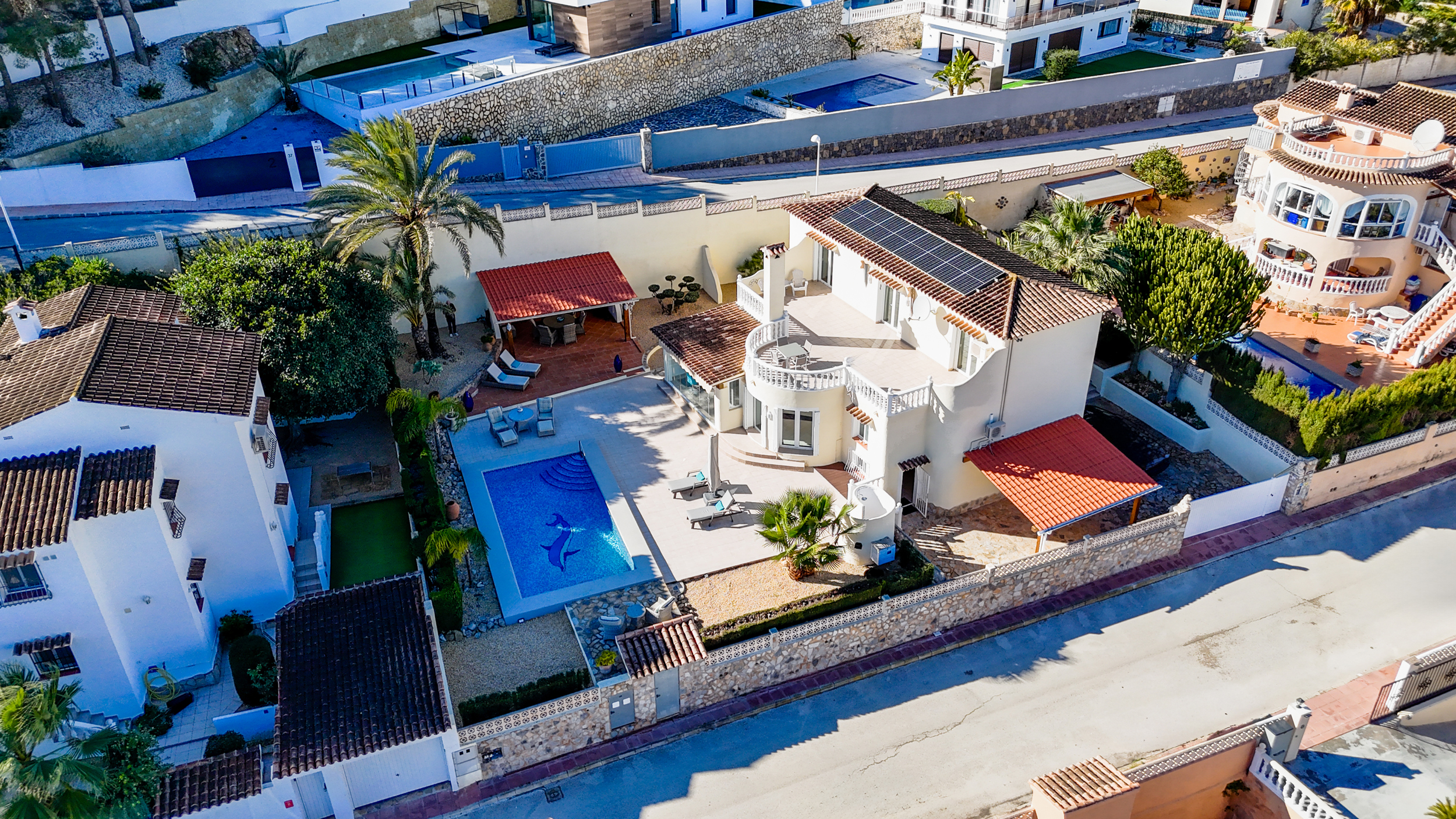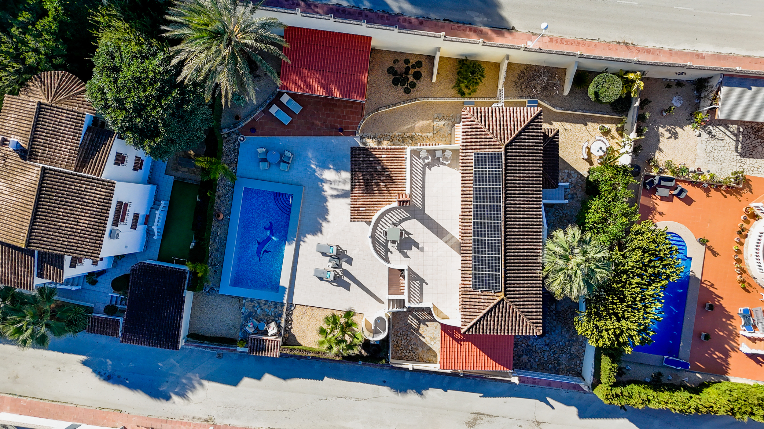 Afuera, la verdadera vida mediterránea te espera. La piscina invita a refrescarte en los días calurosos, mientras que el jardín sigue siendo un lugar agradable por la tarde gracias al sistema de riego y a la iluminación exterior atmosférica. Las terrazas cubiertas con ventiladores proporcionan sombra y confort incluso durante los meses más calurosos.