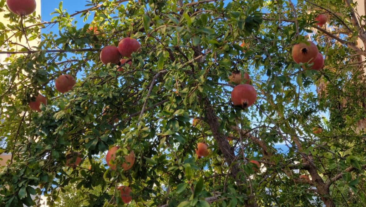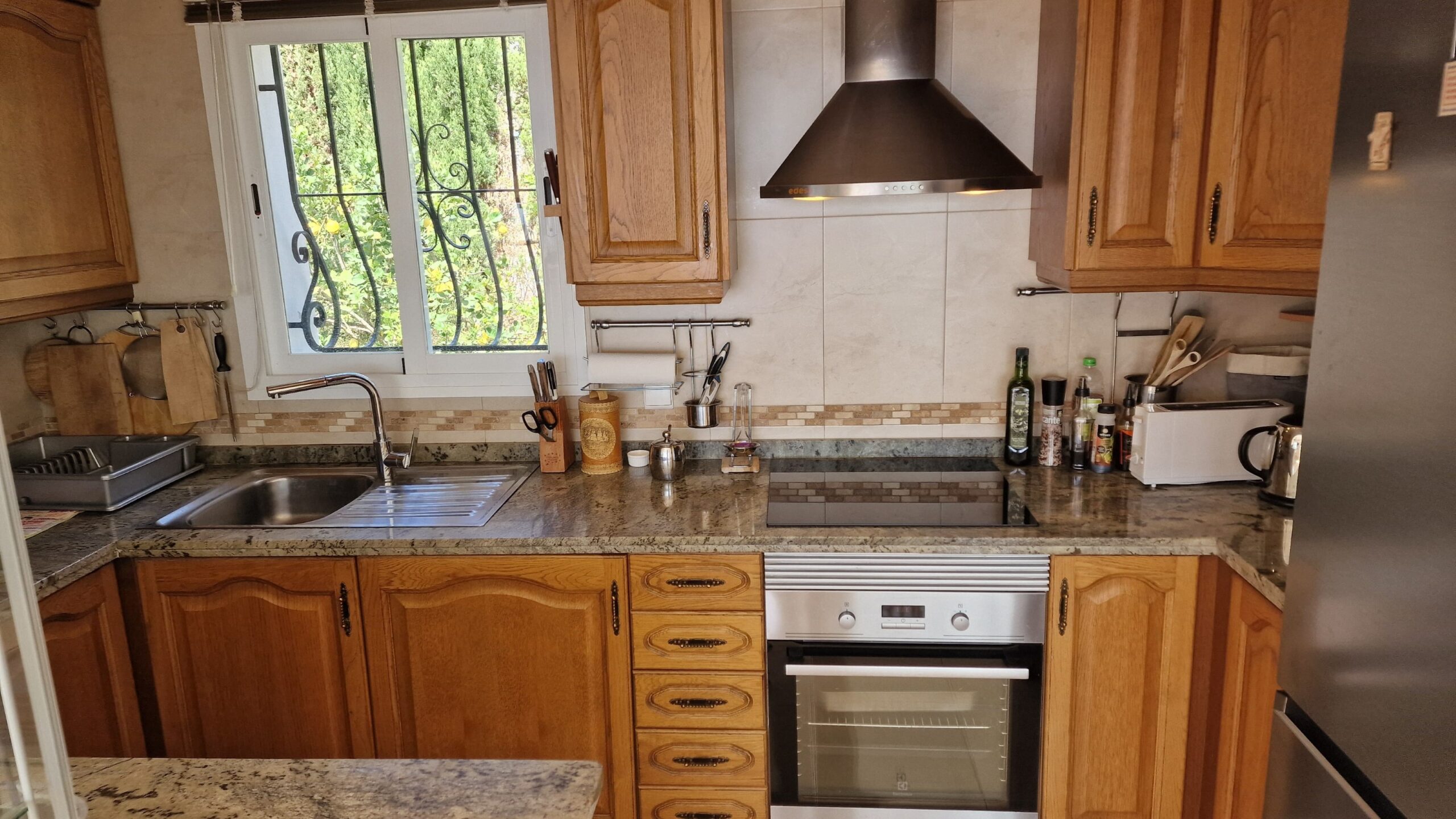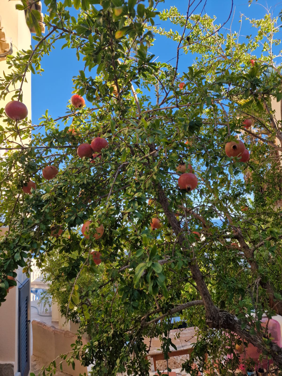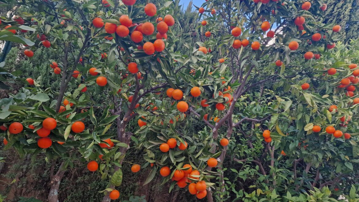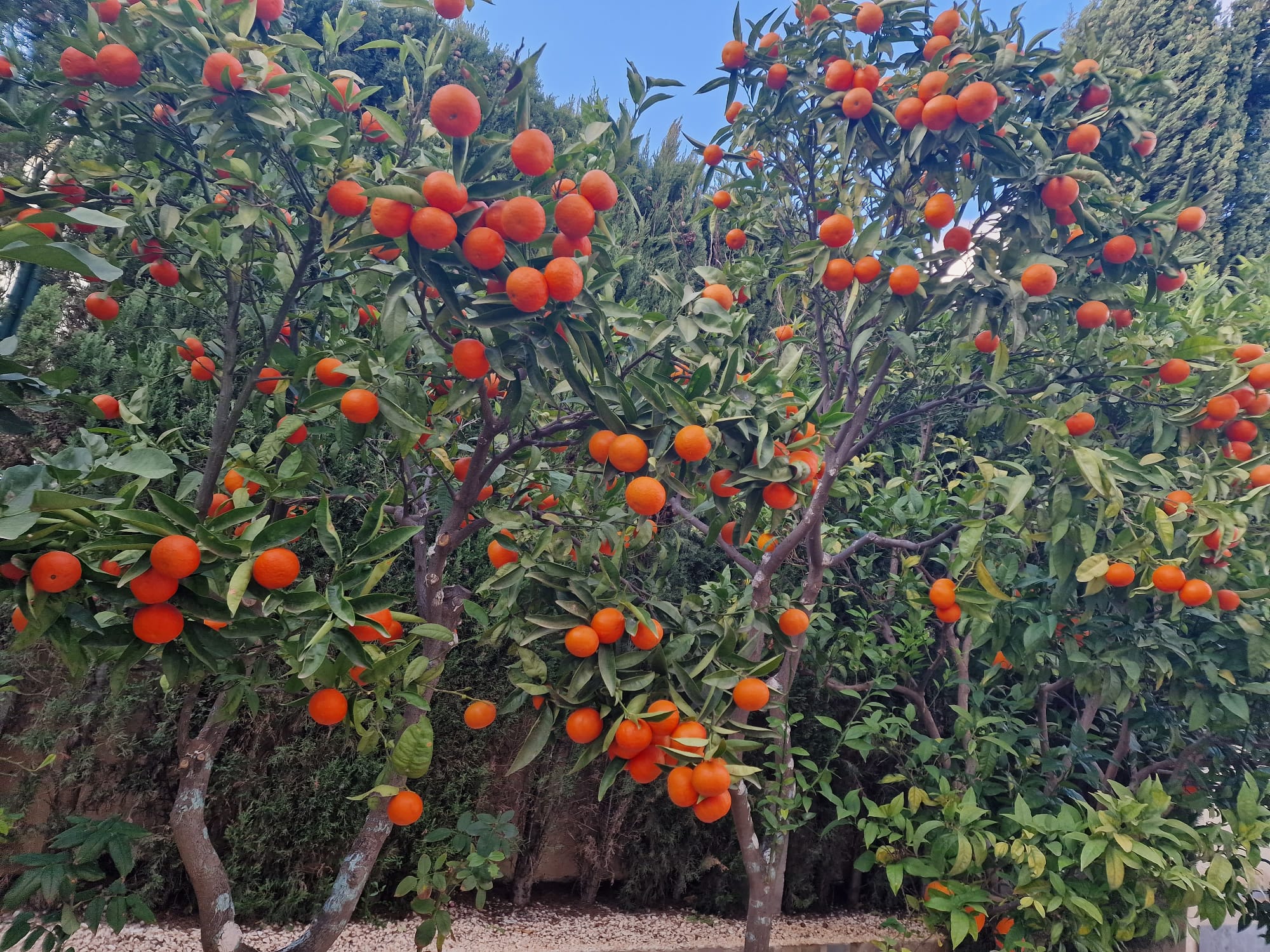 El jardín delantero ofrece una encantadora variedad de árboles frutales cítricos, aportando un toque de encanto mediterráneo a esta elegante propiedad.