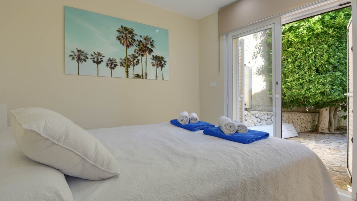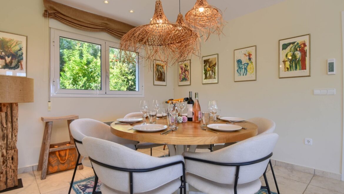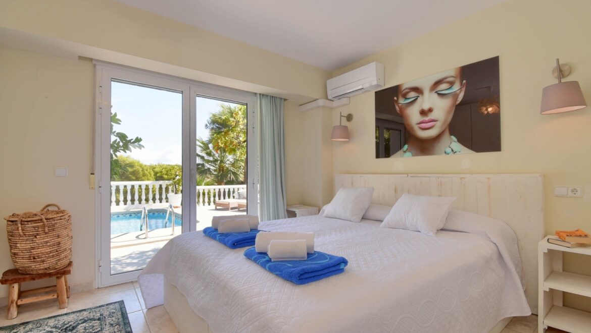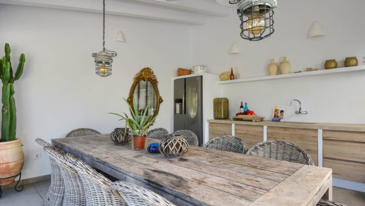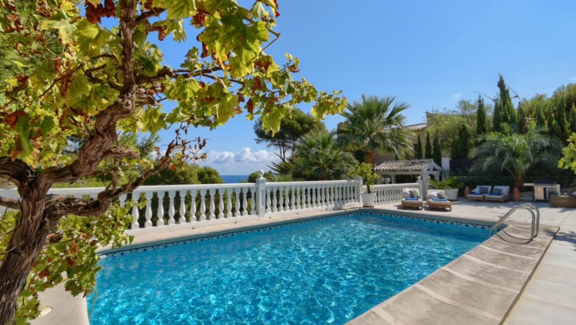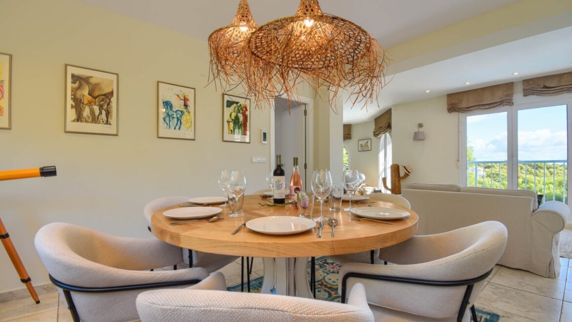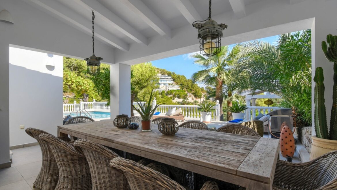 En el exterior, disfrutará de un exuberante jardín con árboles maduros y una piscina privada de 8×4 metros, rodeada de cómodas tumbonas y varias zonas de estar. La villa cuenta con cuatro terrazas, tres de ellas cubiertas, ideales para cenar al aire libre o relajarse mientras se disfruta de las vistas panorámicas al mar Mediterráneo. Una barbacoa y una ducha al aire libre completan el cuadro.