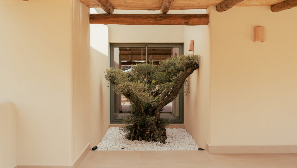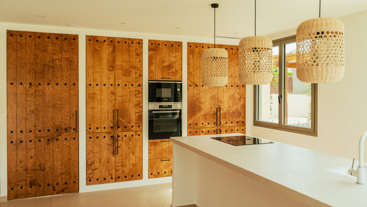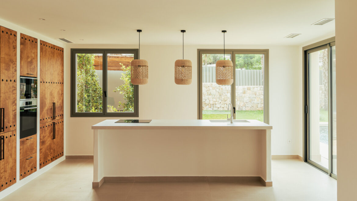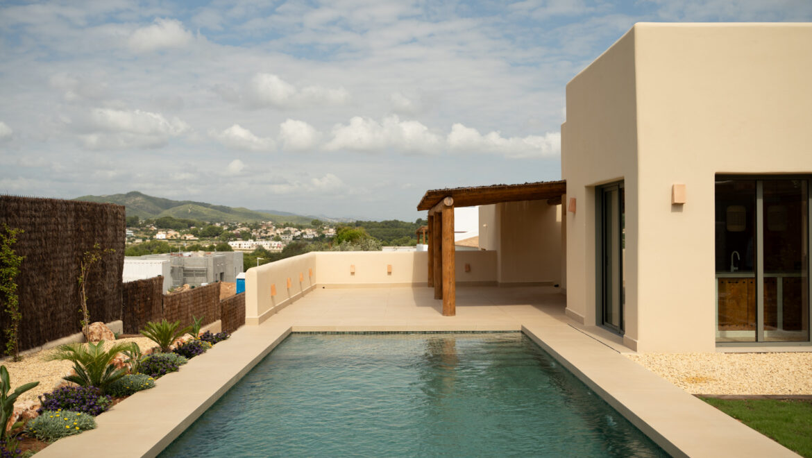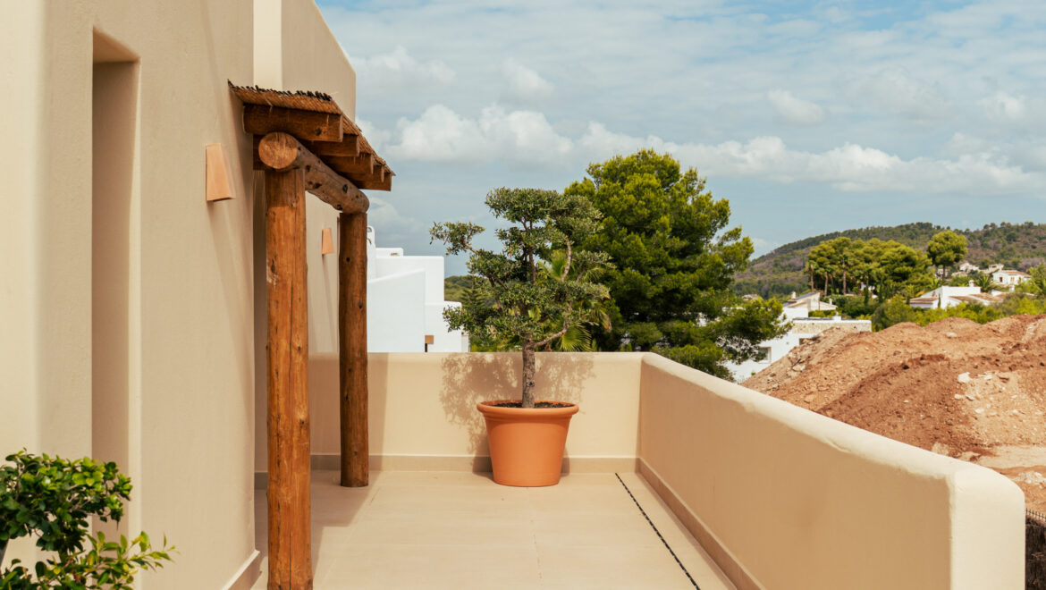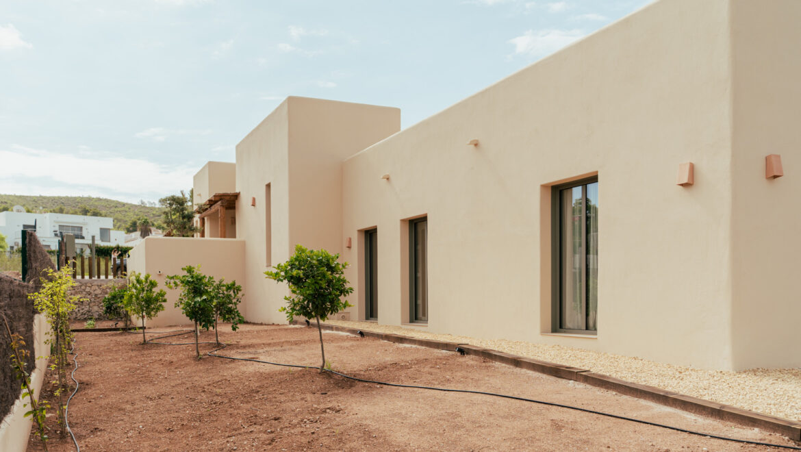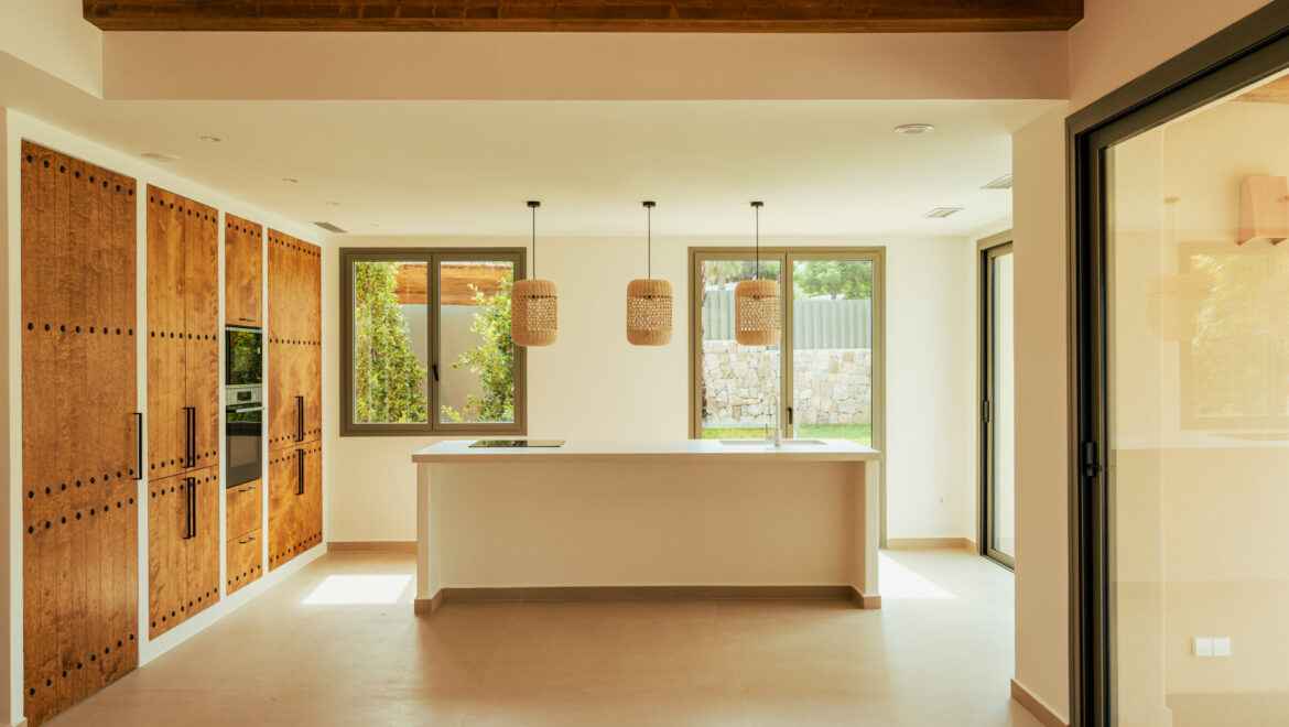 CA Los Olivos es una exclusiva villa mediterránea–ibicenca en venta en Jávea, con orientación suroeste que garantiza una excelente entrada de luz natural durante todo el día. Su arquitectura destaca por esquinas redondeadas, techos abovedados y vigas de madera vistas, inspiradas en las curvas del paisaje mediterráneo. El tejado de tejas de arcilla y las grandes ventanas con contraventanas refuerzan su carácter auténtico y crean un ambiente luminoso, cálido y tranquilo. La vivienda se distribuye íntegramente en una sola planta y cuenta con un amplio salón-comedor, cocina totalmente equipada, lavadero, tres dormitorios con armarios empotrados, tres baños en suite y un aseo de invitados.